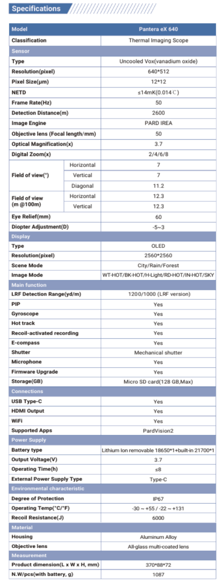 Eigenschappen van de PARD Pantera eX 640 50mm LRF